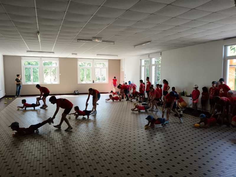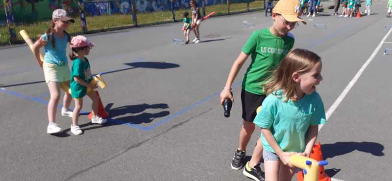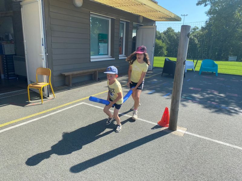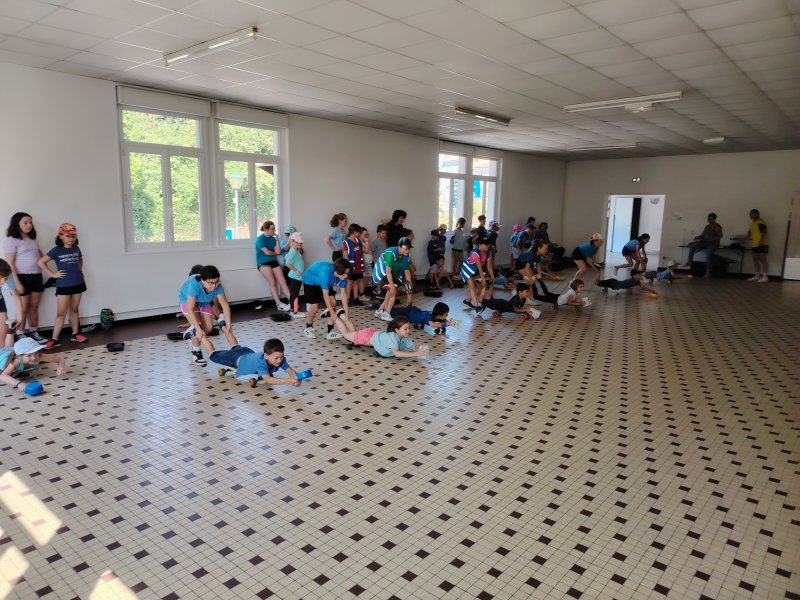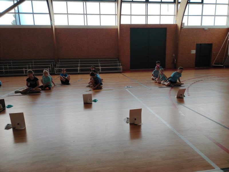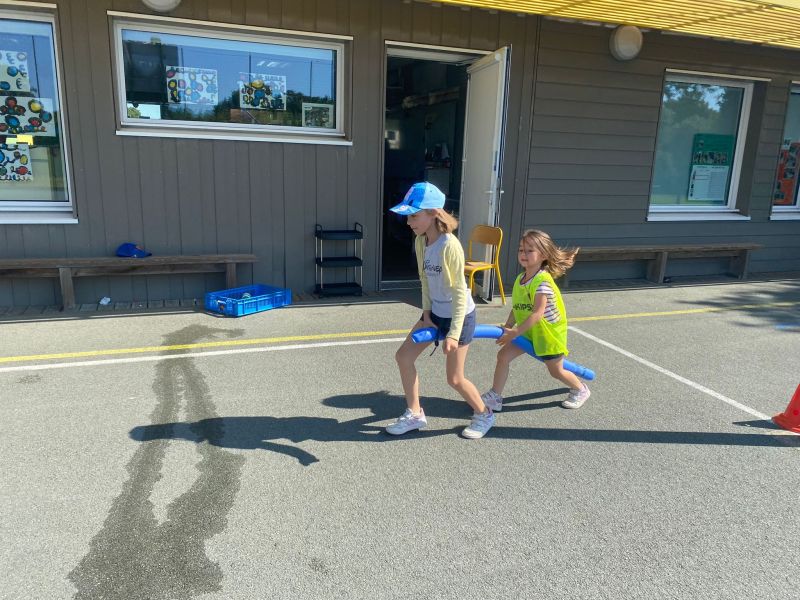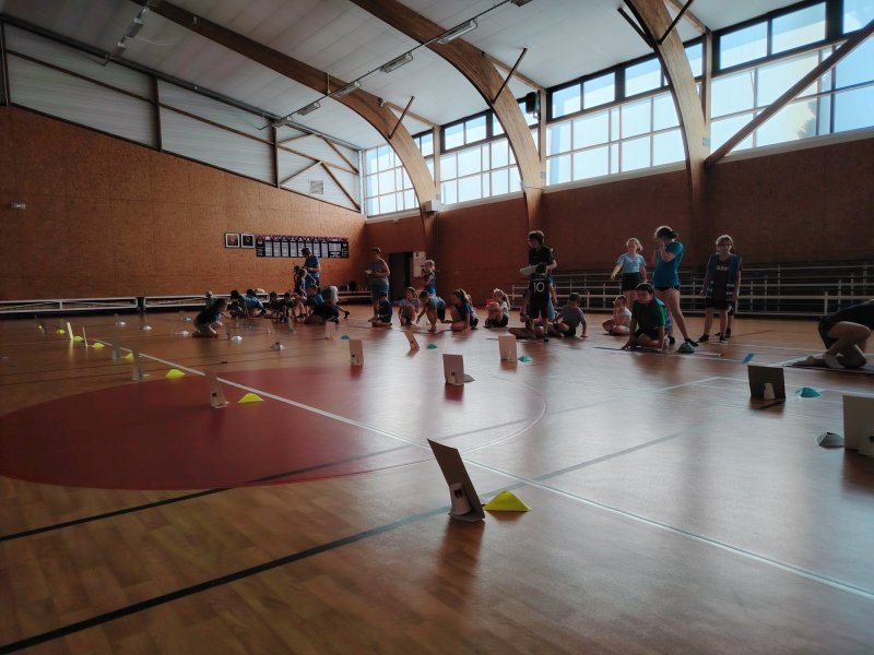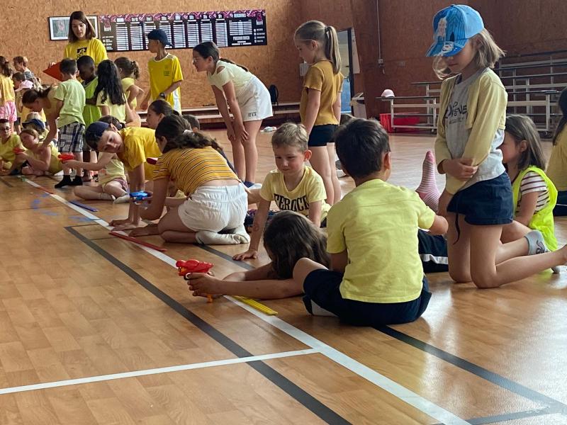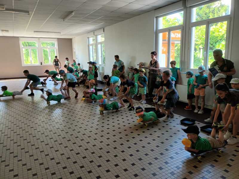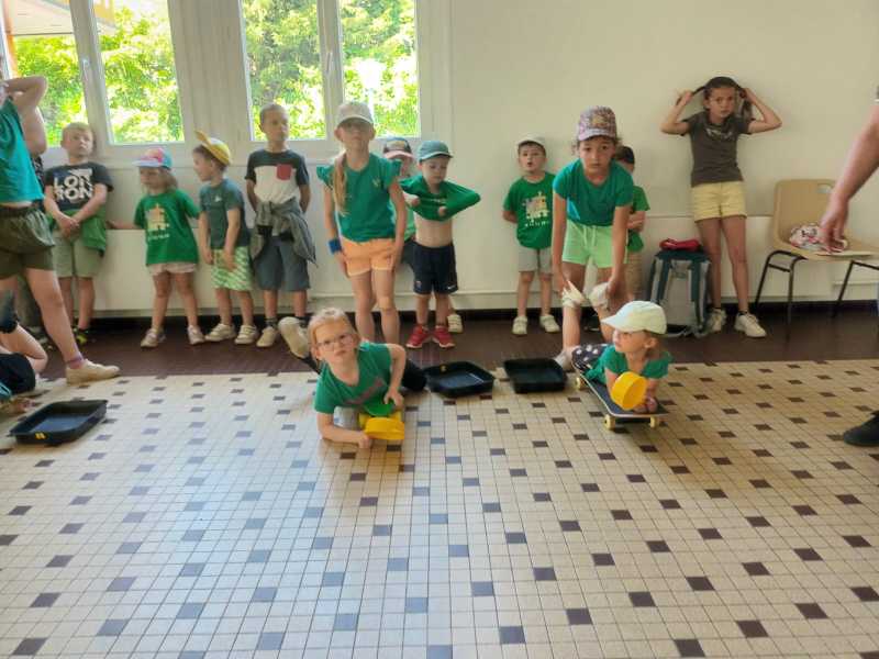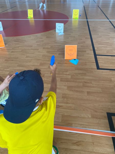 Puis, après un petit échauffement, les équipes ont commencé le roulement des 5 ateliers : le tir avec des Nerfs, les chaises musicales collaboratives, l’hippo-glouton avec skateboard, lancer de sacs dans des cerceaux et relais de -frites à 2.