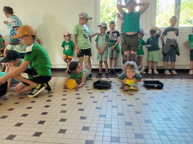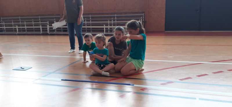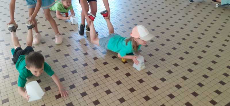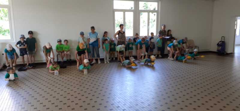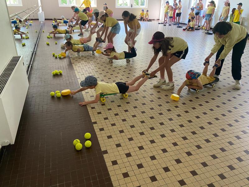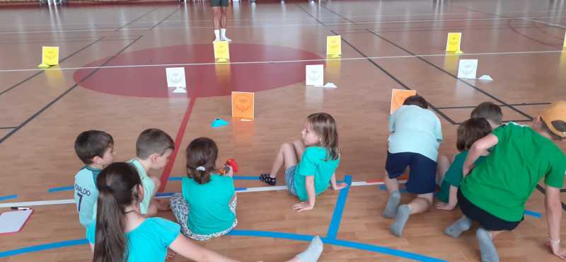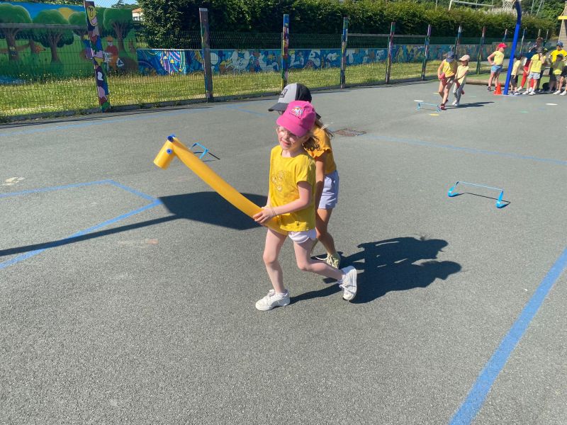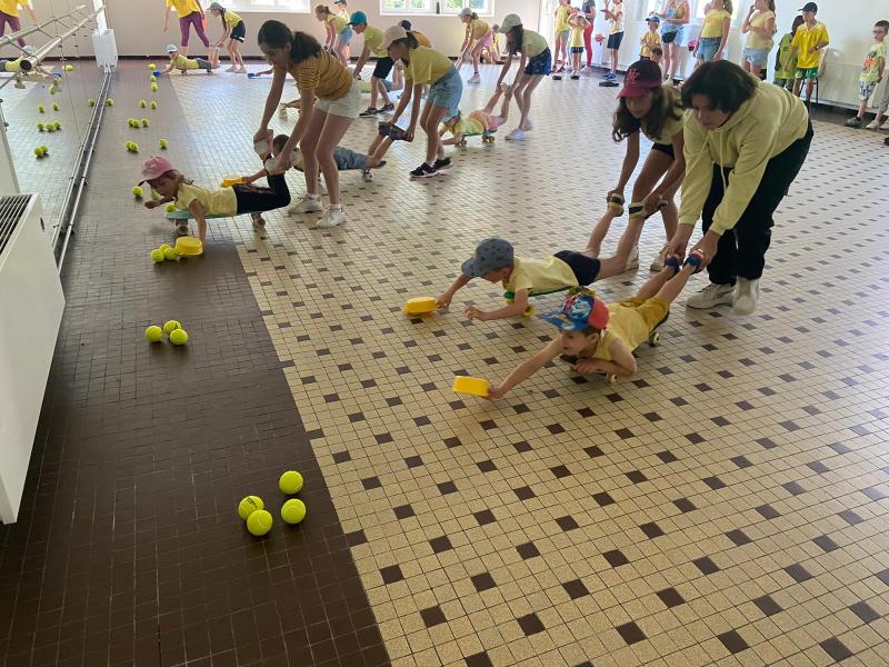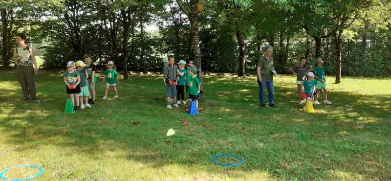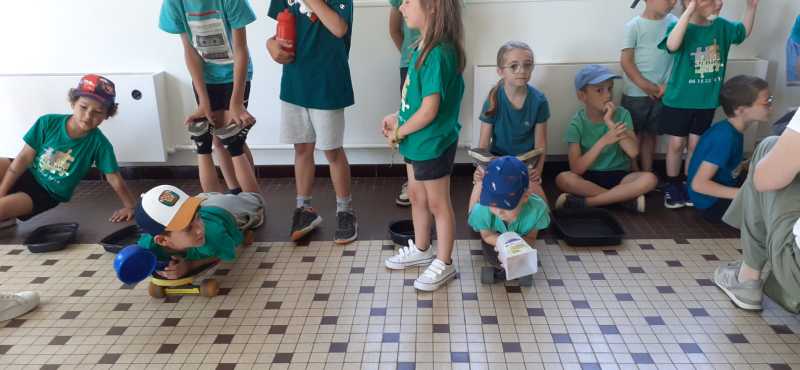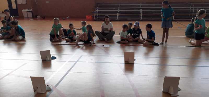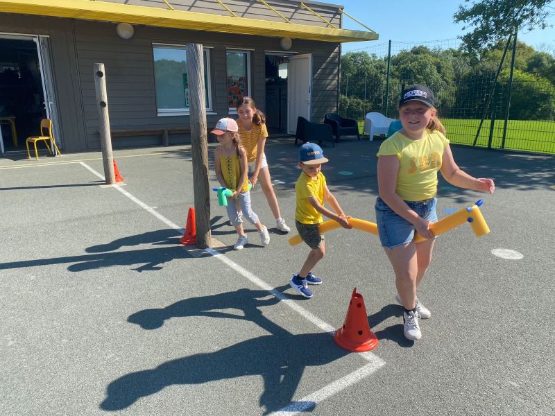 Puis, après un petit échauffement, les équipes ont commencé le roulement des 5 ateliers : le tir avec des Nerfs, les chaises musicales collaboratives, l’hippo-glouton avec skateboard, lancer de sacs dans des cerceaux et relais de -frites à 2.