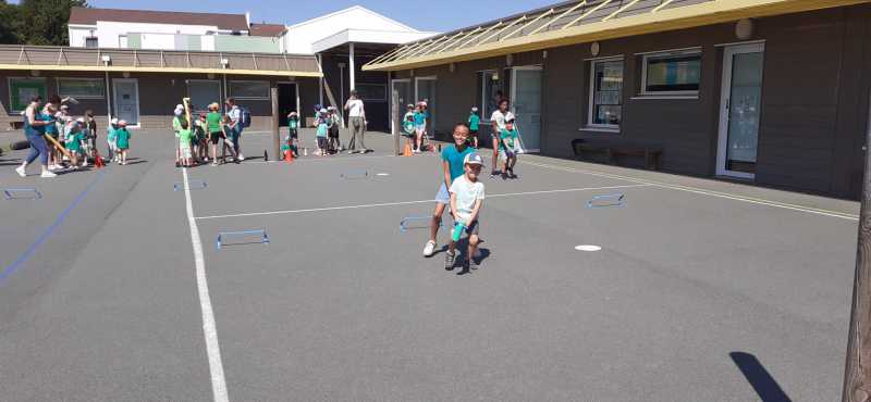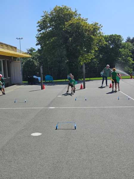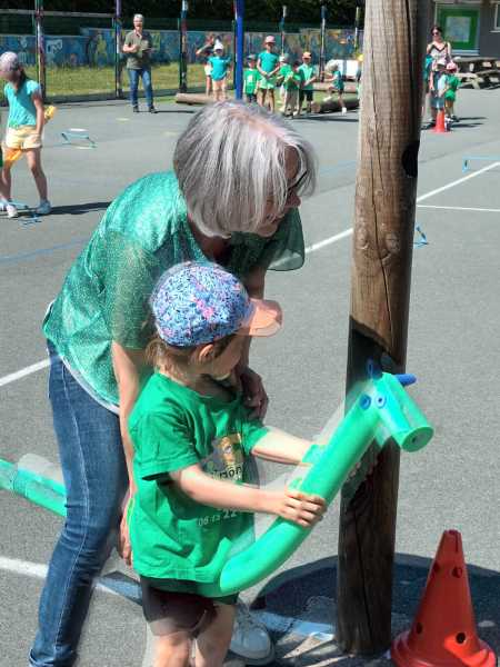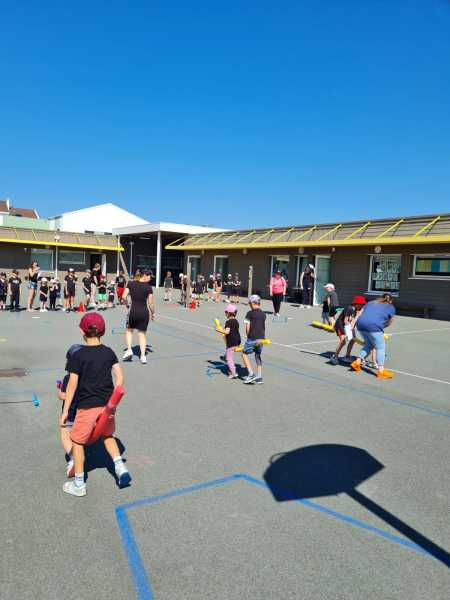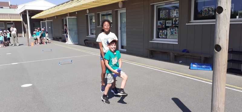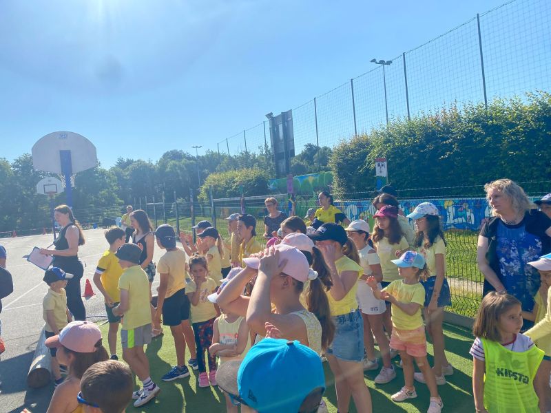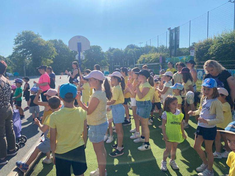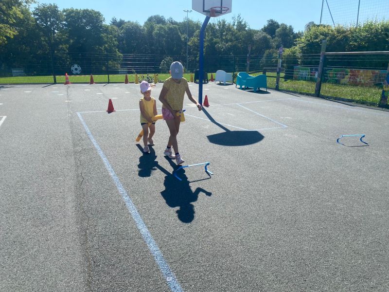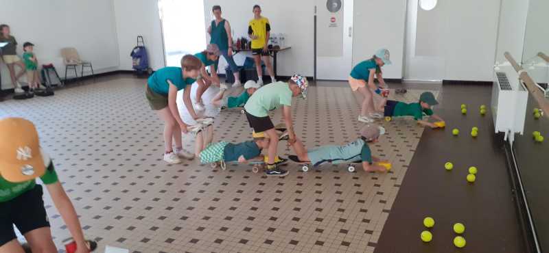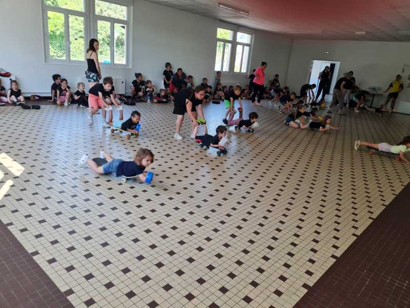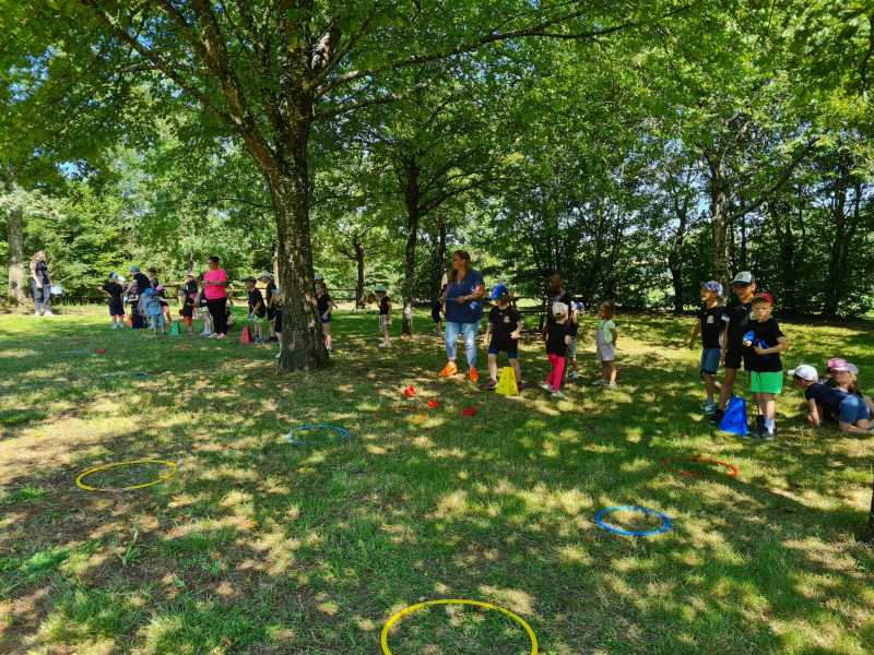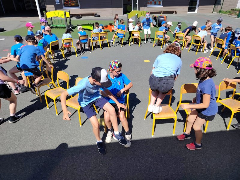 Puis, après un petit échauffement, les équipes ont commencé le roulement des 5 ateliers : le tir avec des Nerfs, les chaises musicales collaboratives, l’hippo-glouton avec skateboard, lancer de sacs dans des cerceaux et relais de -frites à 2.