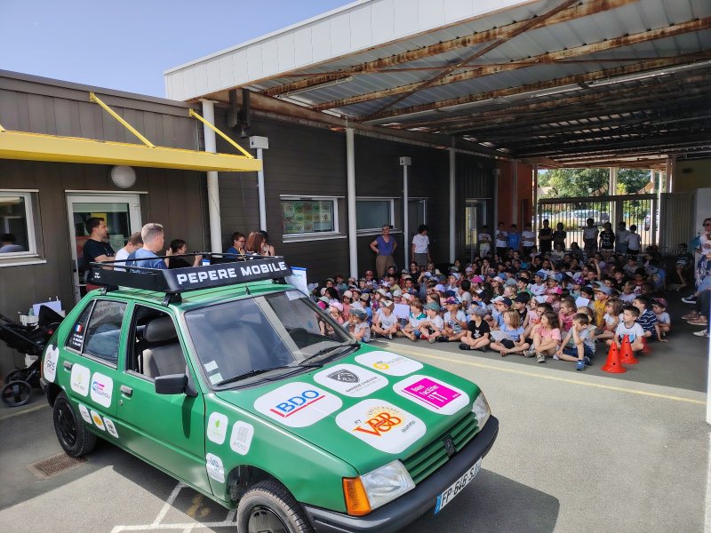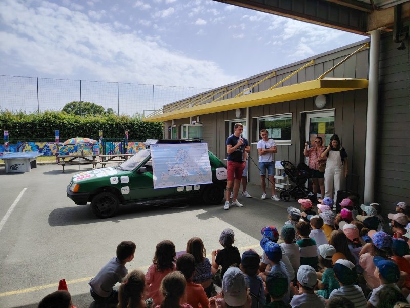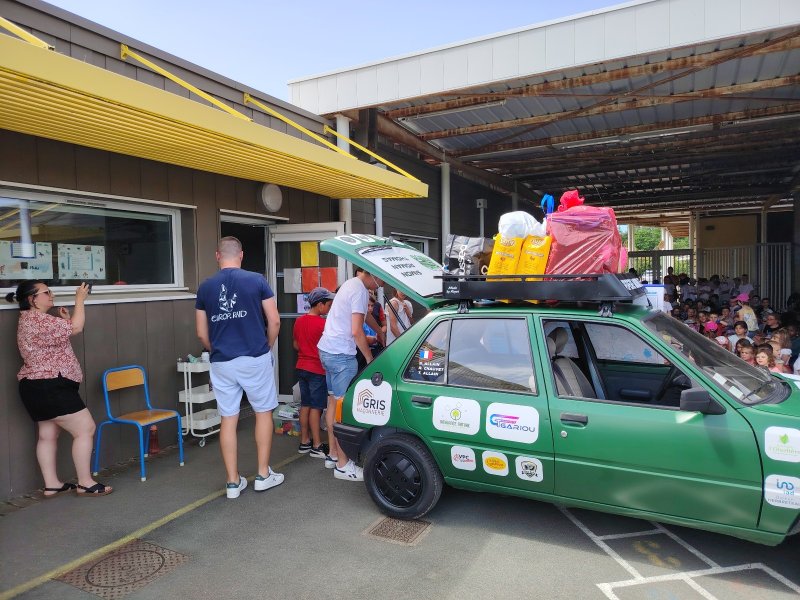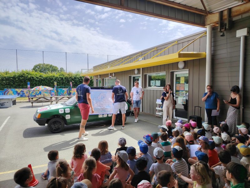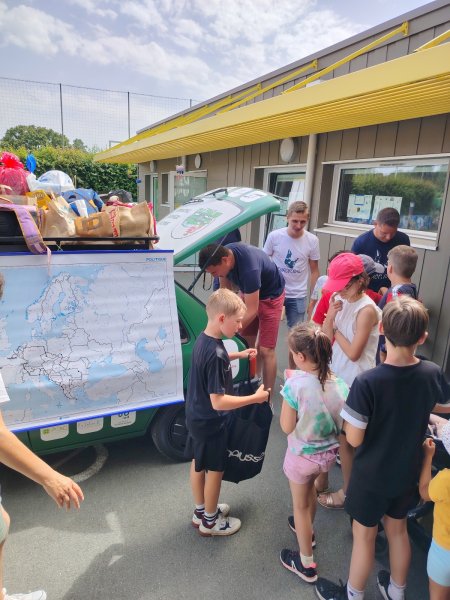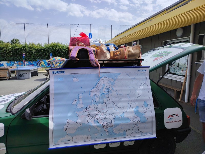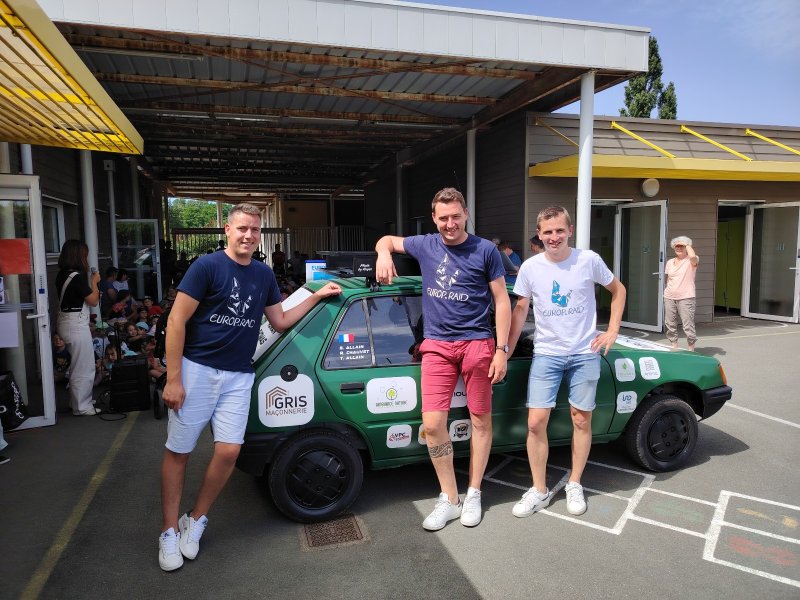 Vendredi 28 juin, les 3 membres de l’association SI.RO.TO (Simon, Roman et Thomas) sont venus présenter le périple qu’ils vont entreprendre début août pendant 3 semaines à travers 20 pays d’Europe. Ils sont venus avec leur 205 Peugeot dans la cour de l’école.